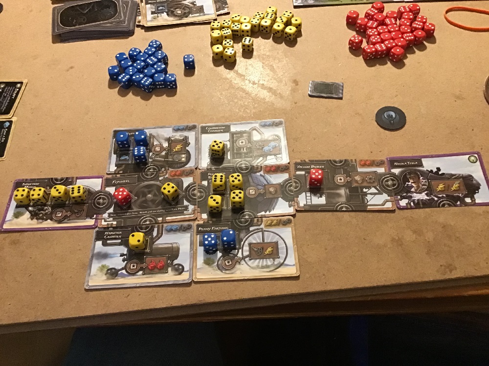 If rolling big piles of dice isn’t your thing, then you might not like this game. Even with the Cogs to modify the dice, a couple of rounds of really good or really bad rolling will take their toll.