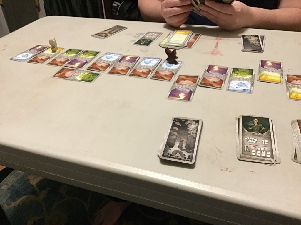 The artwork is very pretty and the difference of color on the terrain cards is appreciated (I confused the badlands and the fjords a few times but for the colors). The set up and playtime is quick and you could easily fit in several games in the times it takes to set up some games (I’m looking at you Eldritch Horror & Arkham Horror). I was taught the rules pretty quickly and the Loki card illustrations are fairly intuitive for how they are used, making me pretty sure that non gamers and kids would be able to play it pretty quickly as well.