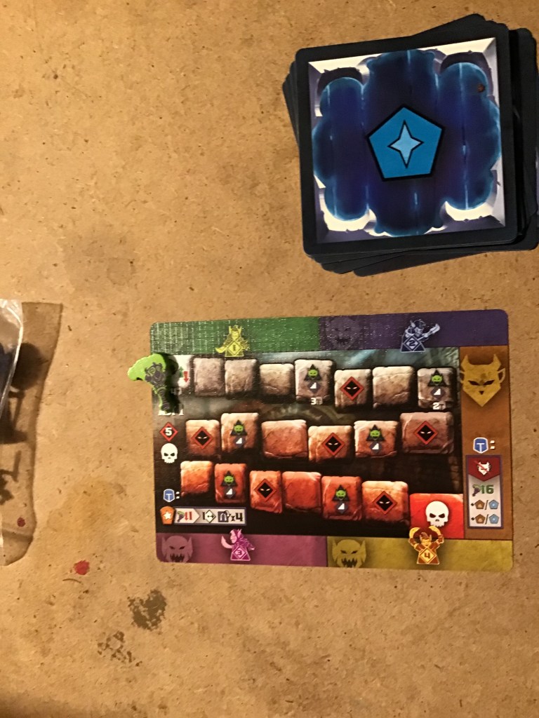 The goal is to explore the tile based dungeon, defeat minions (really, they are more like mini bosses) and goblins (a recurring monster but with different stats each time) and eventually uncover the dungeon boss for the final battle. We didn’t get as far as the boss and after three attempts, still haven’t managed to beat the countdown. Like various Pandemic style games, there are multiple ways to lose including running out of time, needing to place a 5th goblin on the board, or not uncovering the door to the final boss.