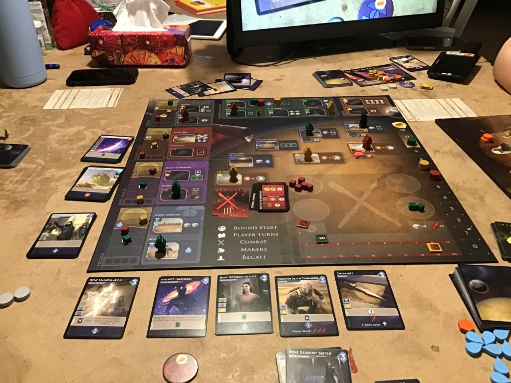 This is the exciting part – weighing how important it is to use a card to gain faction influence and gain victory points or to use them to improve your deck for the future. Another game that engaged me like this was Tyrants of the Underdark, a criminally under-rated board game of deck building and region control with at least five different ways to gain victory points. Even on the rounds where I couldn’t purchase a new card, I still had plenty of other options of things to do with the action spaces. The starting hand isn’t just gain more cards or attack – they include gaining faction influence and activation of board spaces for different effects. I found it highly amusing and appropriate that the Dagger card could count for combat strength or for placing a worker on a Landsraad action (the Landsraad being the ruling body made of the Great Houses).