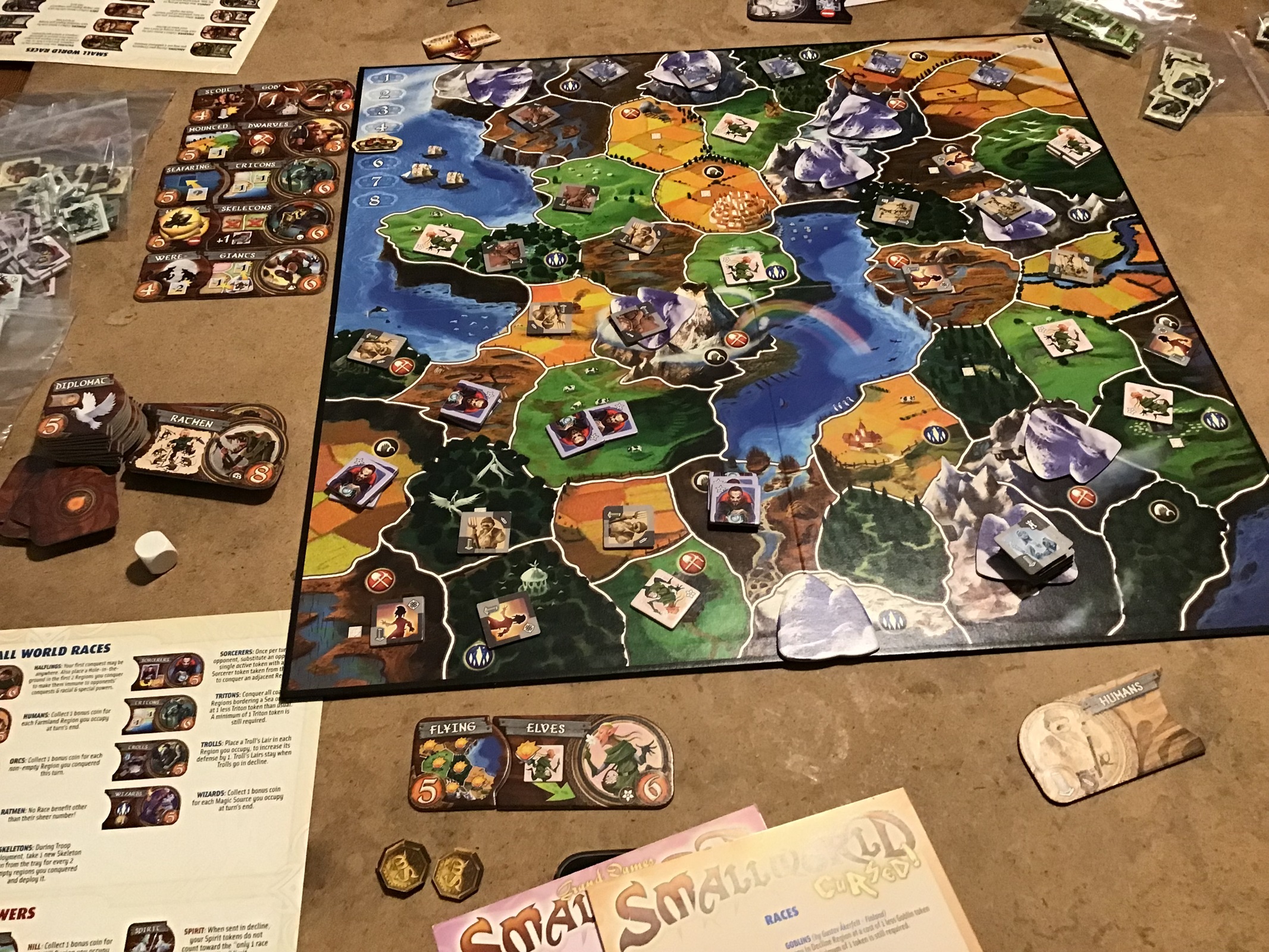 Play a kingdom of a random pairing of fantasy race and a trait, grab as much land and victory points as you can before their fall before other kingdoms or even your own new kingdom on the rise. The game ends at a set number of rounds, most victory points wins. I like that is has variety due to the random pairing, though some are more powerful or much weaker than others and some require some very cunning strategy and luck at dice rolls to succeed, and if you’ve got a loser combo then there is another one to replace it soon enough. I’m also a fan of games with an end game after a set number of turns so it doesn’t descend into a forever grind for a win ala Risk. It’s got nice chunky cardboard pieces and the colors are pretty easy to identify.