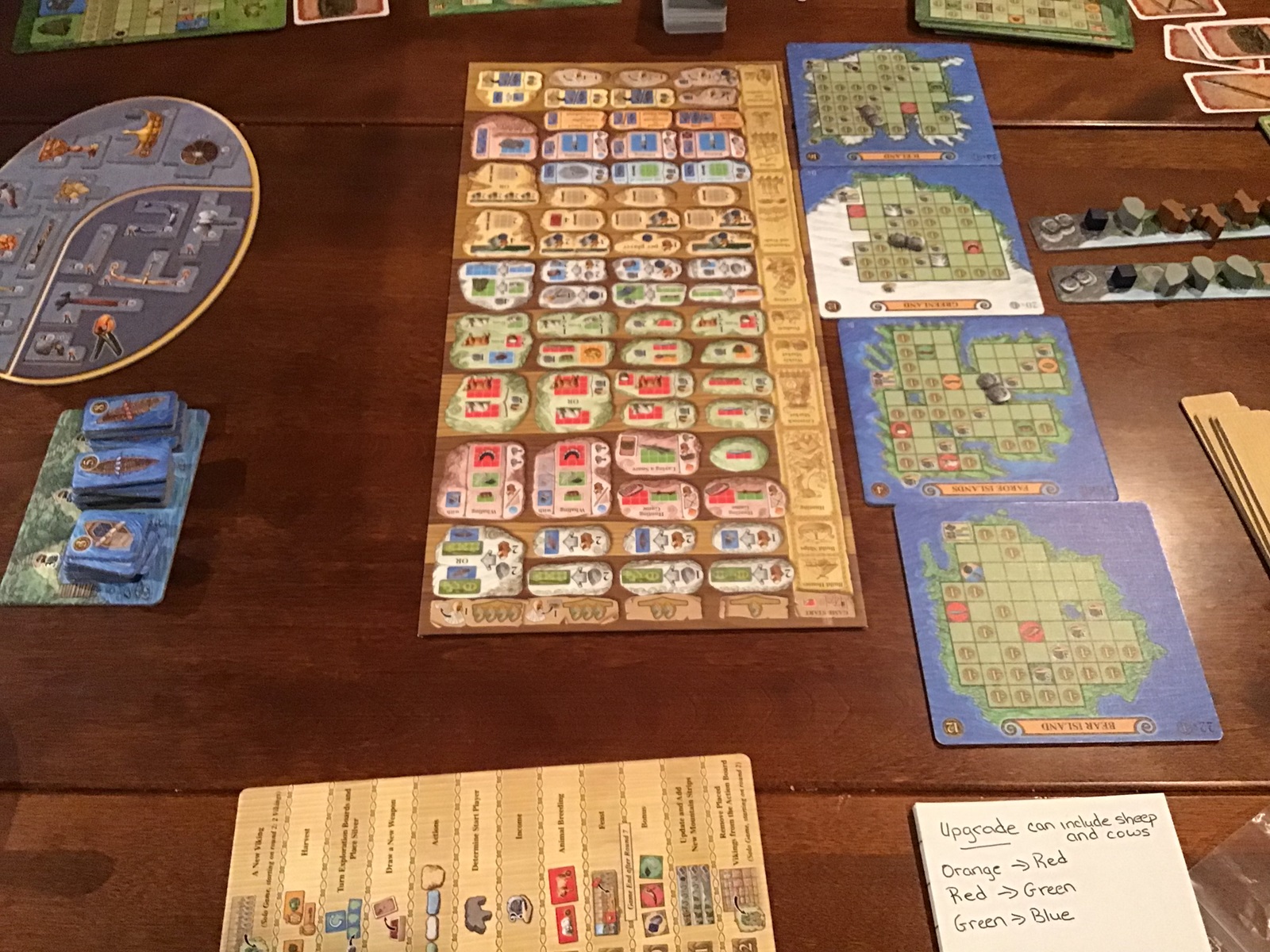 This will be at least the second time I’ve played FfO and I think I’m getting the hang of it (though I did still manage to misinterpret one of the ways to score points so I’ve still got some learning curve ahead of me). Gather resources by hunting or raiding, spend them to gain tiles and better ships to score victory points in the end game, all the while making sure you have enough variety of food for the feast each turn. The primary mechanic is worker placement and you can get more workers but it will cost short term to activate that worker and long term by needing a bigger feast. If you enjoy games like Agricola, you’ll probably enjoy this one.
