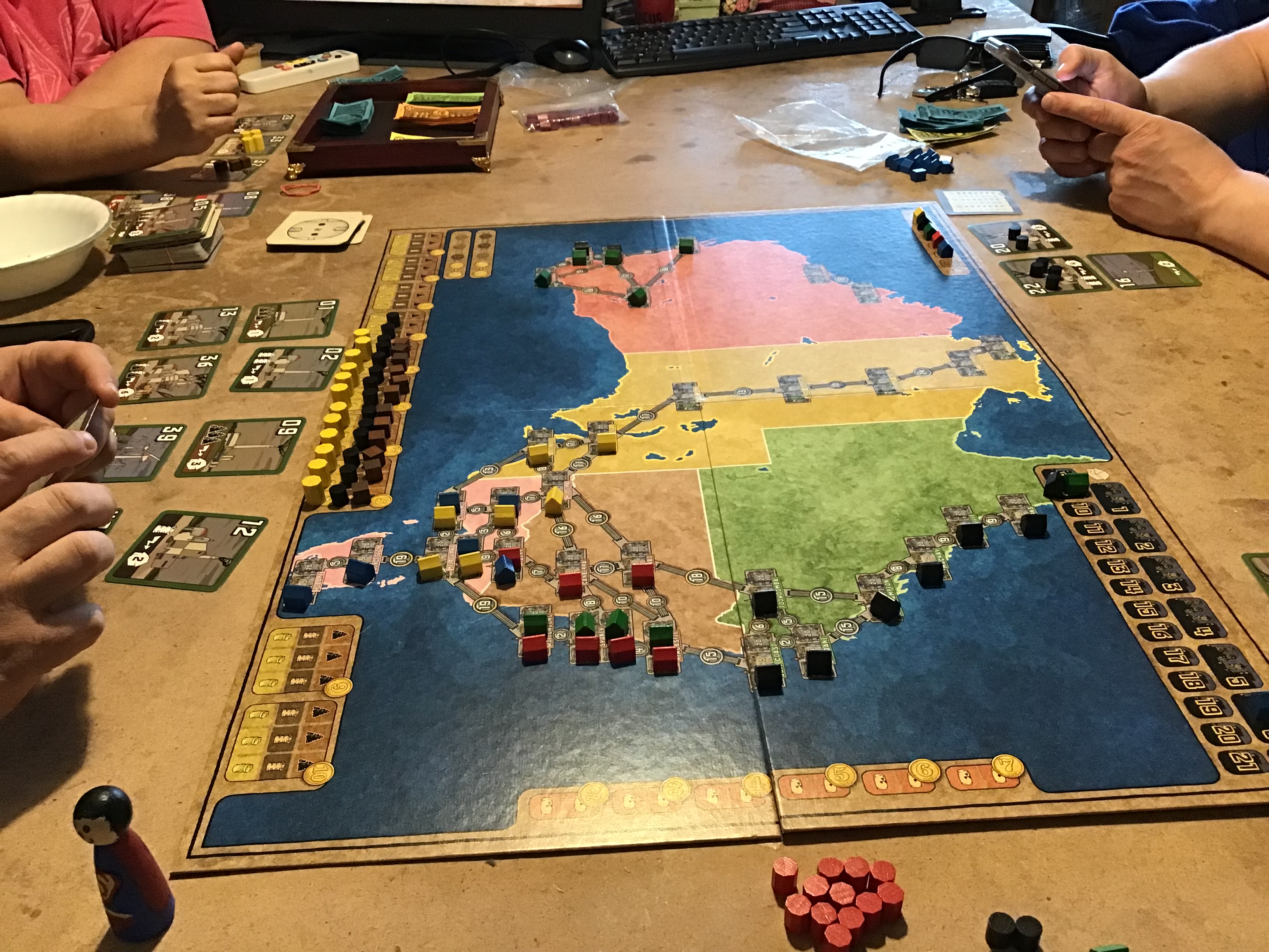 Compete against other players in auctions to acquire power plants and their required fuels (be they powered by coal, oil, trash, nuclear, or wind) so you can make money by supplying cities in your power grid. It’s got much of the mechanics of many rail building games plus the wrinkle of spending money to get more efficient power plants. Just like many rail building games (I’m looking at you Ticket to Ride) there are plenty of expansions allowing you to power up South Africa or Australia or acquire additional power plants). We played the Australia expansion and that track across the middle was expensive to build!