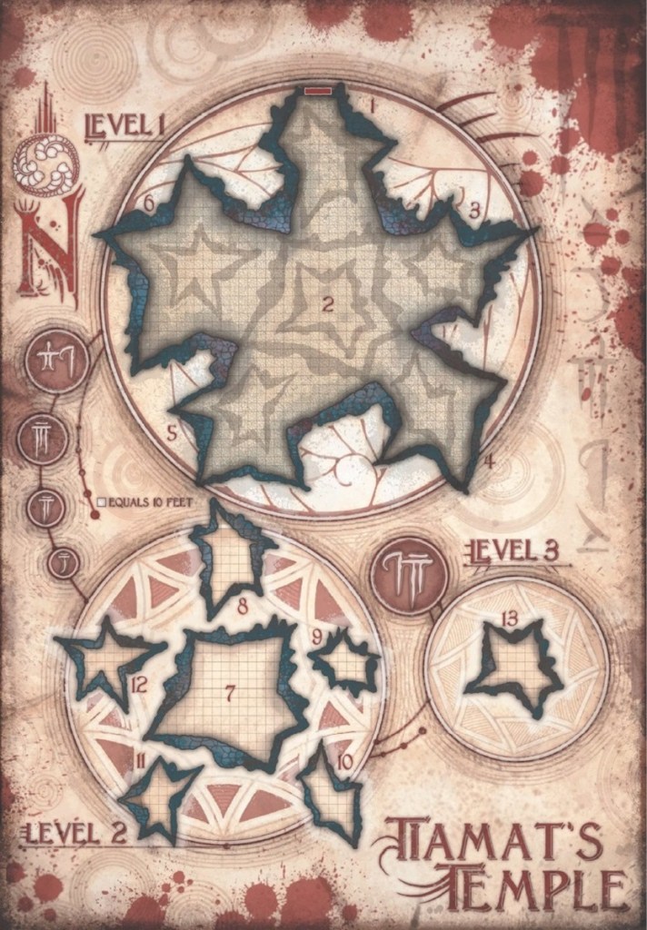 It’s a huge map and I was already experiencing major lag and other tech problems with Roll20 for large maps. My choice was to condense it all to one map and use a mini vertical map to indicate the altitude of each character. What’s the points to having up to 150 feet of play space if it isn’t going to get used? To that end, I set up chanting cultists at the peaks of each of the ‘cones’. There were a few other complications of extra creatures added in for various reasons (including dragons from a previous encounter that had been driven away that wound up in this encounter). The Roll20 result was this –