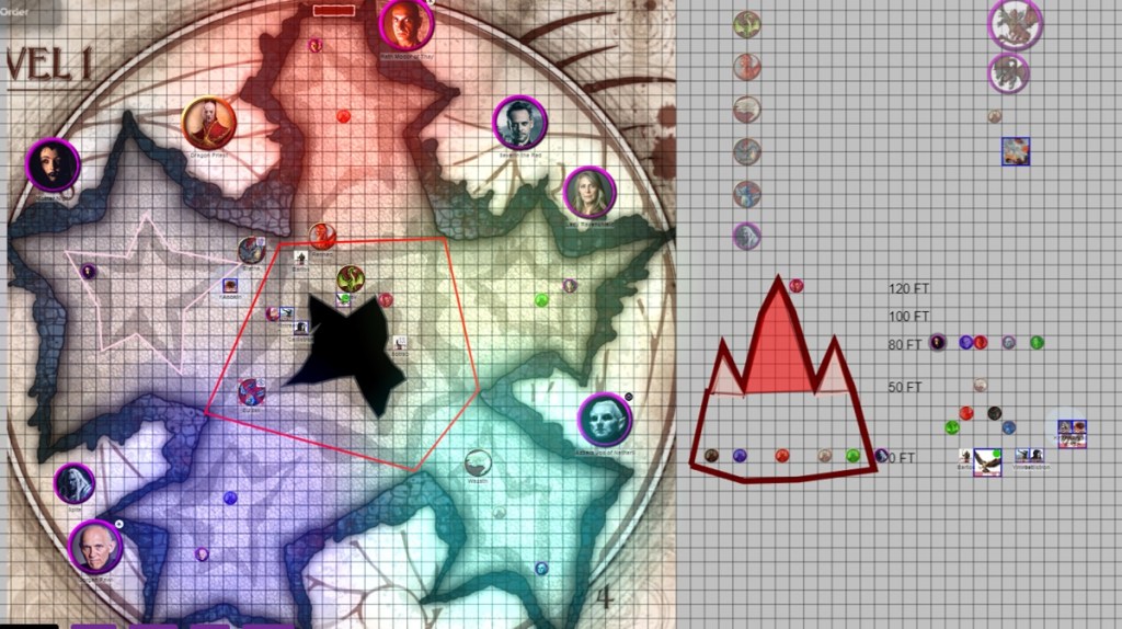I designated certain heights as containing a narrow 10 foot ledge around the inside of the cone so that melee engagement was a possibility and creatures could snipe without having to concentrate on flight at the same time. That might have been an error, but I’ll see as the encounter progresses. Instead of working out the strict line of sights, I set it up as zones. Below 50 feet everything could see everything unless there was a wall in the way. Above fifty feet, one had to be in the zone of the cone (as marked by the red line to further simplify at what point one crossed the jagged grey boundary) to have line of sight above fifty feet. The pink was to draw attention to the inner ‘stars’, that the higher peaks were narrower and limited in space. Then to the right, a token for each character was set up according to what altitude they were at on the map (still one square = 10 feet, so not the most majestic peaks with such a broad base compared to the heights). Tokens for large creatures acting as mounts were placed only on the altitude tracker unless they were separated from their riders.