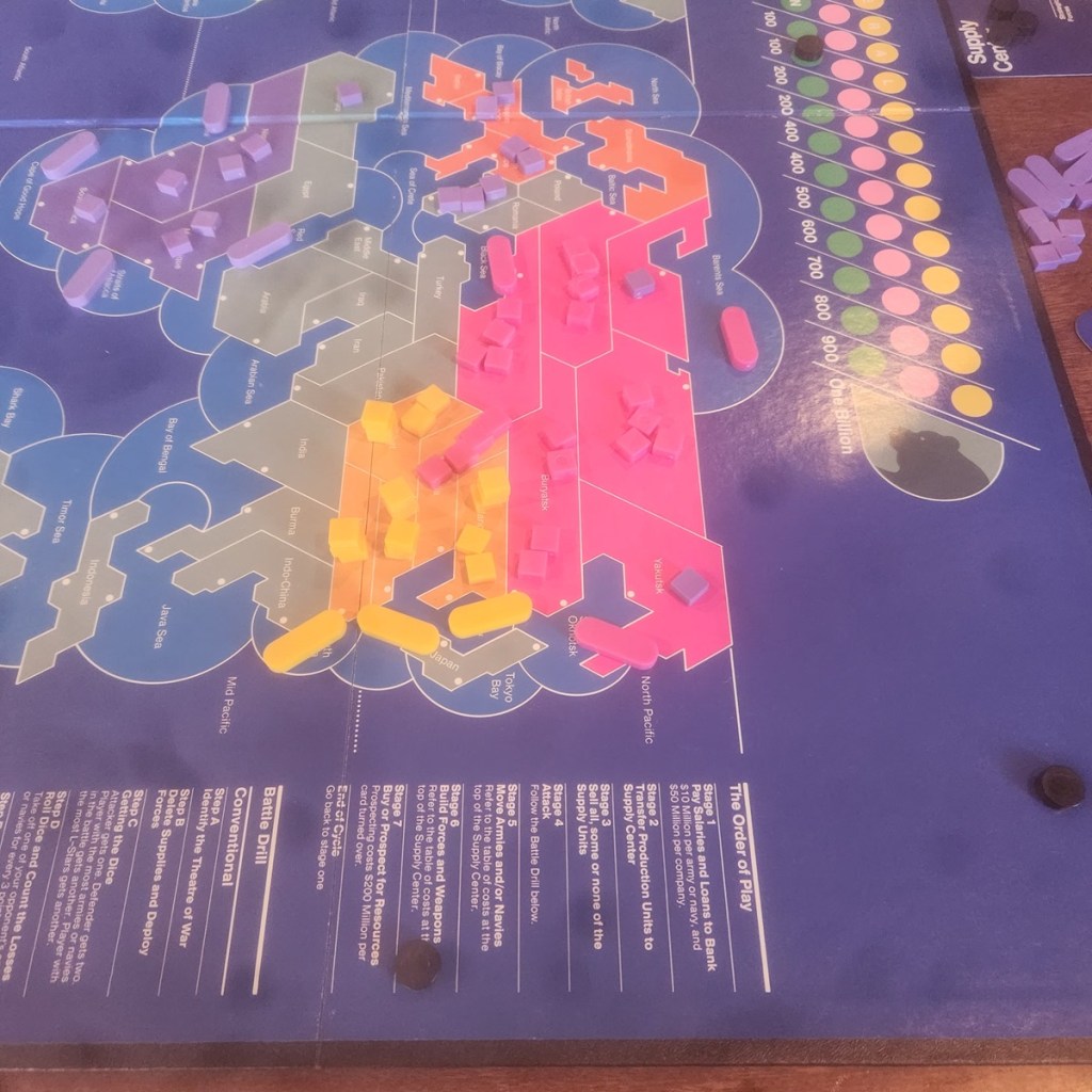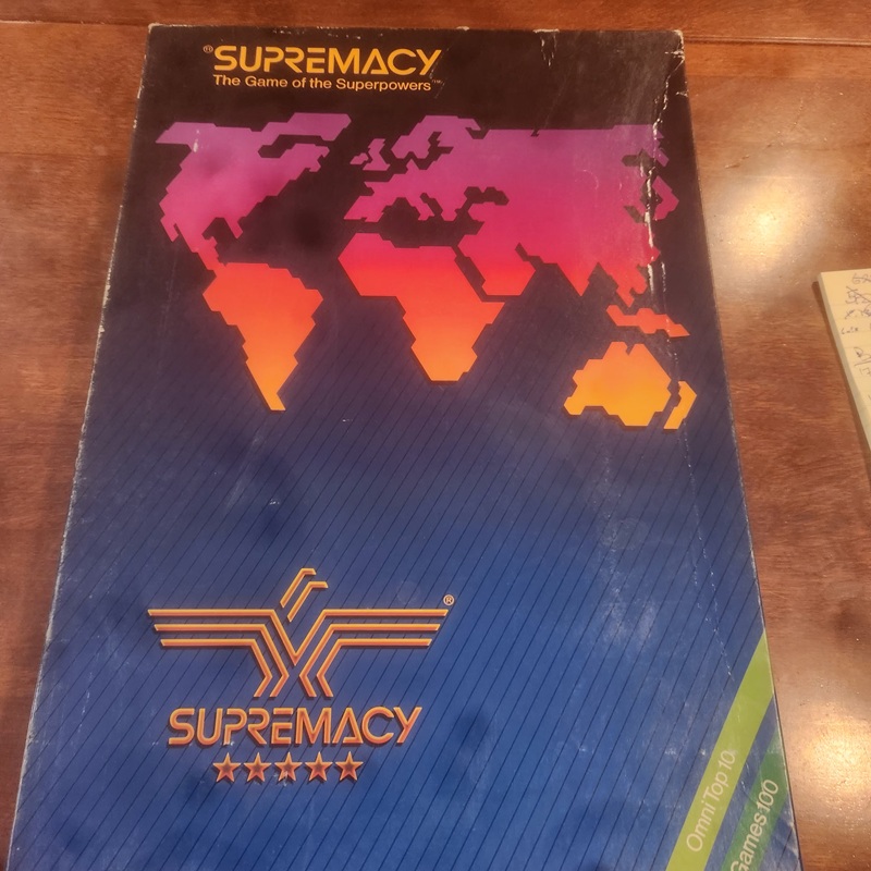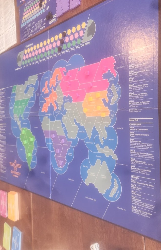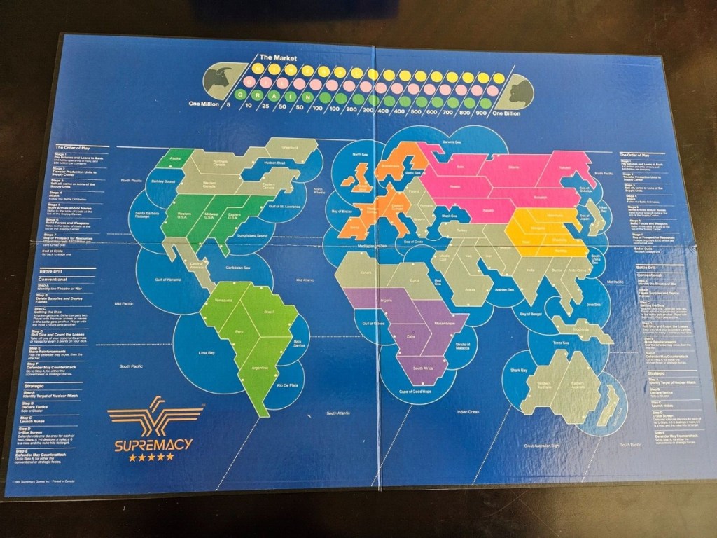 There are some old school games like Careers and Screaming Eagles that will always have a special place in my heart and on my game shelf. Supremacy was a game that I saw played at the University game club, but I never managed to get in on a game. For a long game it had a mythic quality in my mind, having nukes and an economy track mashed with a very RISK like game. When I found a used copy that wasn’t too expensive, I grabbed it, only to have it sit unplayed for several more years until I managed to finally bring it to a table.