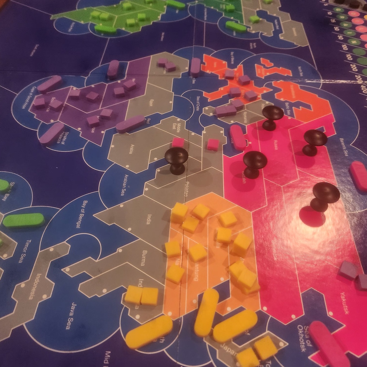 The units are good chunky plastic pieces of simple shapes, similar to Diplomacy, keeping the unit types abstract compared to games like Axis & Allies, Shogun, or many newer games using 3d printed tokens. The types are easy to identify and there is something satisfying with having mini nuclear mushroom to fiddle with. If I had one complaint, it would be of some of the board colours being too close to the colours of the pieces, the pink in particular blending in to the board.