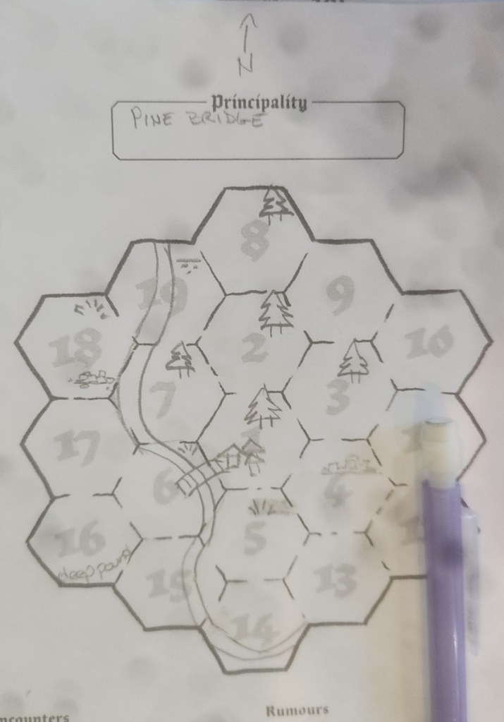 The core book recommends that for a quick start, just roll characters and start at the entry of the dungeon, but that didn’t really capture the exploration aspect that I felt was so core to the experience of Mausritter. Our table hadn’t done much hex crawling except for recently playing Tomb of Annhilation, but the starting map is very small (19 hexes total) and I used landmarks and rumours to guide the exploration to one of four planned encounters (two being dungeons, two being roleplay challenges). The core book includes a short and simple map generation system of terrain and landmarks and encounters. The player copy was filled in along the northern part of the river and around the starting village of Pine Bridge, leaving the rest to be filled in through exploration.
