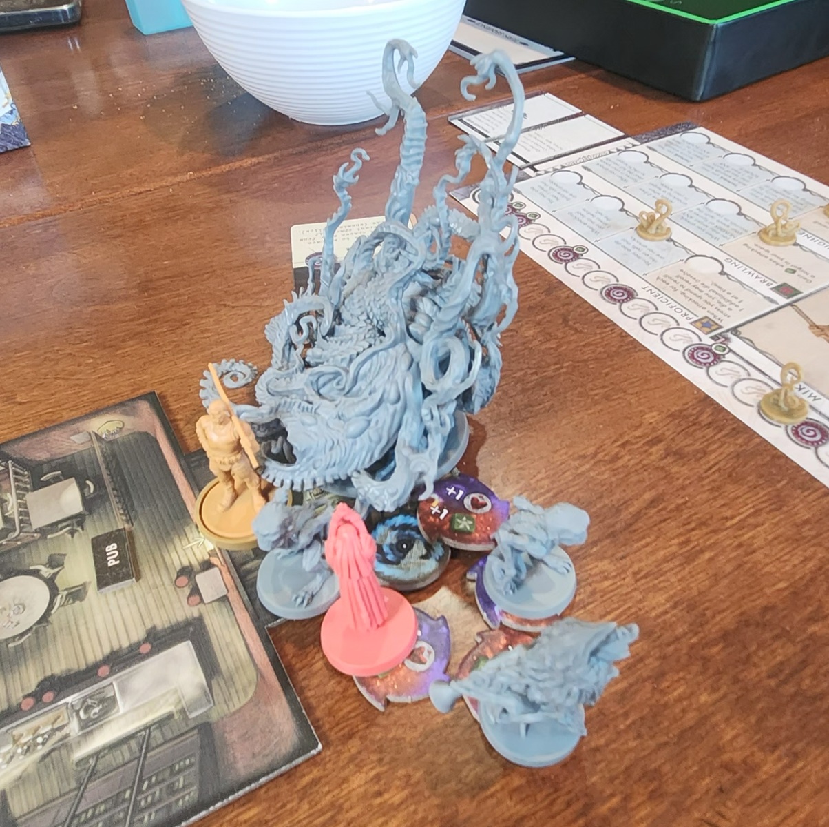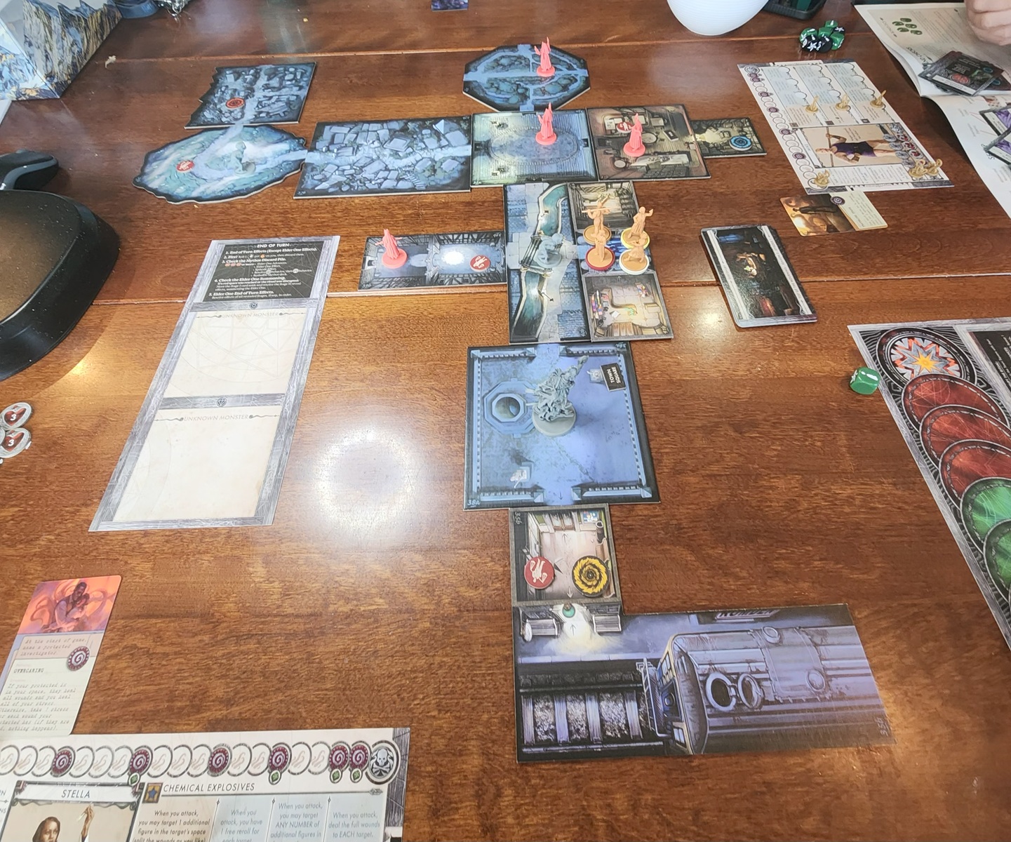 Despite the size of the box and the number of moving parts, the game is pretty simple with most of it’s mechanics. Turn sequence is detailed on the character boards; take three actions, resolve a mythos card, investigate (find stuff) or fight (if in a room with an enemy), resolve end of turn events like being on fire or effects of the Great Old One. There were still some rules we got wrong the first couple of times, but there are a number of useful FAQs out there (thank you Board Game Geek! in particular) for clarifications. Also useful, each box set was stand alone so it wasn’t required to start with the first box before jumping into the second one. Even the individual episodes (so far as I’ve seen) only had narrative connection between them, allowing for easy replay of favourite episodes without having to back track or reset characters like a standard legacy game. It does mean that these is no benefit to completing episdoes 1 – 5 before diving into episode 6 but that’s fine by me – I’ve got enough legacy games to scratch that itch.