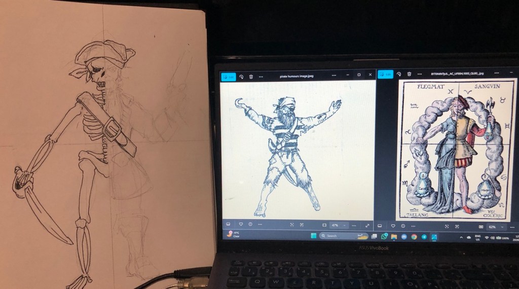 Meanwhile, working on some art for the cover page of the trifold. Image on the far right is from a period humours woodcut. Middle of a Vitruvian Pirate idea I had, showing many missing body parts. Far left is the current idea of a skeletal side and a pirate side.